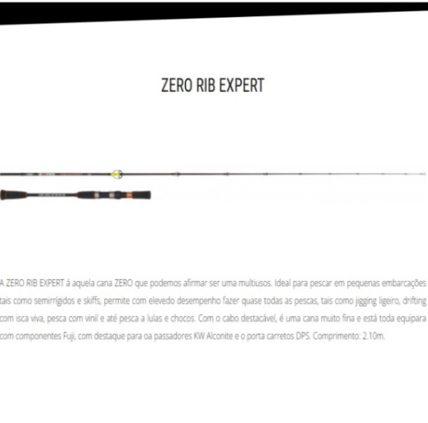 A ZERO RIB EXPERT á aquela cana ZERO que podemos afirmar ser uma multiusos. Ideal para pescar em pequenas embarcações tais como semirrígidos e skiffs, permite com elevedo desempenho fazer quase todas as pescas, tais como jigging ligeiro, drifting com isca viva, pesca com vinil e até pesca a lulas e chocos. Com o cabo destacável, é uma cana muito fina e está toda equipara com componentes Fuji, com destaque para oa passadores KW Alconite e o porta carretos DPS. Comprimento: 2.10m.