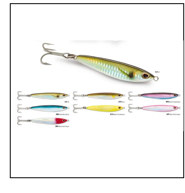 Observações: As Metal Jigs são zagais fabricadas em forma de S, de forma a proporcionar uma acção pronunciada de um peixe ferido. Munidas de fateixas de qualidade e um acabamento Top, estas amostras têm uma acção incrível e conseguem provocae todo o tipo de espécies pelágicas.